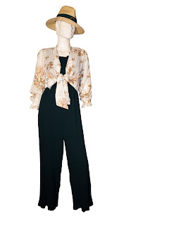 This outfit consists of a deep green, soft crepe material jumpsuit, which we think is absolutely gorgeous! It gives a lovely fit around the waist and has the wide legs that are everywhere this summer. It is loose fit, for sizes 10-14, length 58 inches. We have combined it with a gentle, light cream chiffon patterned shirt, size 10-12, tied at the waist to give that effortlessly stylish look. By keeping with a neutral colour palette this outfit could be worn for almost any occasion. We have teamed it up with a straw trilby hat with deep green sache to give it a daytime festival feel. This outfit is quirky and fun yet contains all the right ingredients to keep you on trend and standing out from the rest of the crowd, where ever you decide to go this summer.